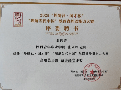 10月25日-26日,由陕西省教育厅主办、外语教学与研究出版社协办的2025年“外研社·国才杯”“理解当代中国”陕西省大学生外语能力大赛在陕西交通职业技术学院举办,由我校公共课教研部教师蔡建平、张立峰、陈婷婷指导的五名参赛学生发挥出色,斩获一等奖1项、二等奖3项、三等奖1项,成绩斐然。